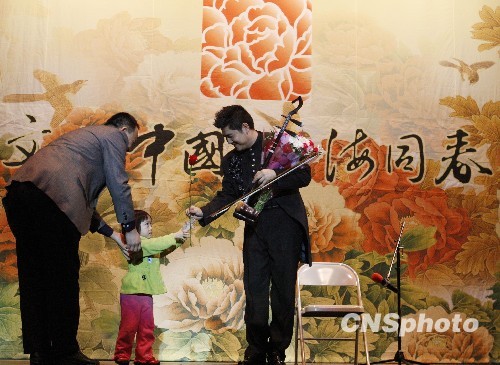 2月26日晚,“文化中国·四海同春”文艺晚会在波士顿拉开大幕,现场观众反应热烈。图为一位当地华人小观众在家长陪伴下,向著名二胡演奏家陈军(右一)献花。中新社发 魏晞 摄