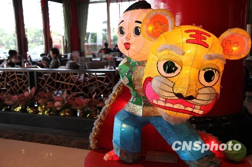 为庆祝元宵节,台北市区各地安放花灯。图为著名的台北圆山大饭店的大堂内摆放的富有中国民间特色的花灯。中新社发 耿军 摄