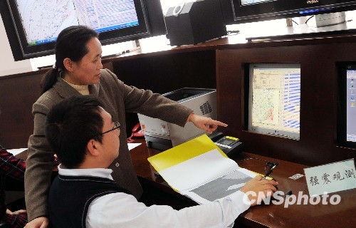 3月4日,福建省地震局预报中心工程技术人员通过福建地震台网监测系统密切关注台湾地震震情。 据中国台网测定,2010年3月4日8时18分50秒,(东经:120.6度, 北纬:22.9度),在台湾高雄县、屏东县交界发生6.7级地震。中新社发 刘可耕 摄