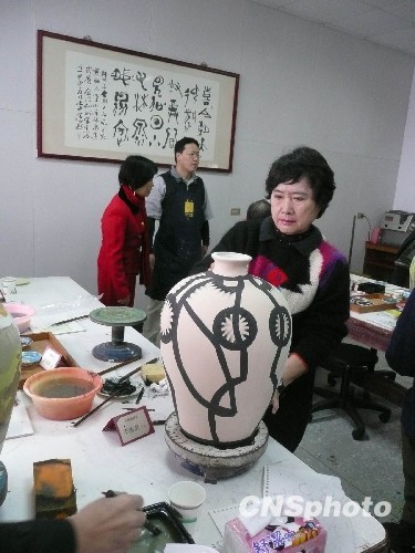 规模空前的华人艺坛盛事、集结百年来500位两岸四地华人艺术家200件作品的《百年华人绘画大观·世界巡回大展》,即将于5月1日在上海世博会上做全球巡回展的宣传站。配合此项展览的《金酒如画一华人艺术家金门彩绘金酒》活动正在台湾金门展开。图为台湾著名女画家李重重在陶瓷上作画。中新社发 闫晓虹 摄