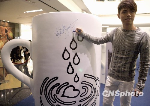 3月22日,香港太古城中心举行“杯中愿行动”启动礼,邀请香港歌手张敬轩、林一峰及Chocolate Rain设计师麦雅端为四只1·7米高的咖啡杯揭幕。他们撕去“铜”及“锌”等贴纸,喻意将污水中的有毒有害物质彻底清除。图为歌手张敬轩签名支持绿色和平防治水污染工作。中新社发 张勤 摄