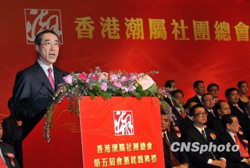 3月23日,香港潮属社团总会第五届会董就职典礼在香港会议展览中心举行。香港特区政务司司长唐英年出席并致辞,赞扬潮州人拥有传统的勤奋团结刻苦精神。中新社发 邓庆乐 摄