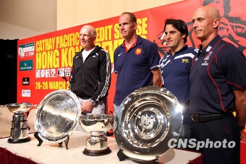 3月25日,前来香港参赛的(左起)法国教练赞硕、新西兰教练蒂根斯、阿根廷名将比曹及美国队教练卡来弗尔出席记者会,分享他们领军及比赛心得。“香港国际七日榄球赛”26日至28日在香港大球场举行,各路雄师已汇集香港,厉兵秣马角逐桂冠。中新社发 洪少葵 摄
