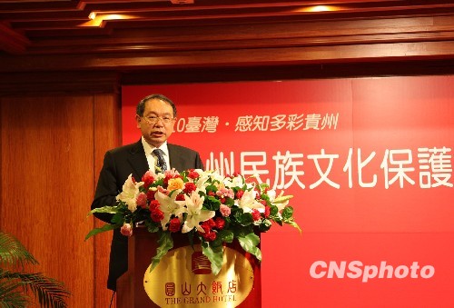 3月25日,率团在台北举办“2010台湾·感知多彩贵州”活动的贵州省副省长谢庆生,在台北圆山大饭店,向台湾艺术界人士做《保护民族文化多样性,让民间工艺美术魅力常青》的学术演讲。中新社发 耿军 摄