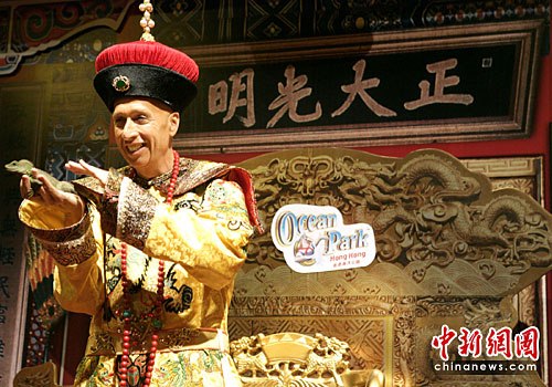 3月31日,一年一度的香港海洋公园高清动物月揭幕礼中,海洋公园主席盛智文化身尊贵的“龙王”向传媒介绍4月2日开始、为期一个月的高清动物月活动,公园举办的蜥蜴展览及以龙为主题的景点,将让游人过一个极富意义的复活节。中新社发 张勤 摄