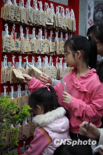 4月4日,是台湾的儿童节,许多台湾小朋友前往台北孔庙拜孔子,并在祈愿墙上挂上自己填写的祈愿卡,祝福健康成长、学业有成。中新社发 罗钦文 摄