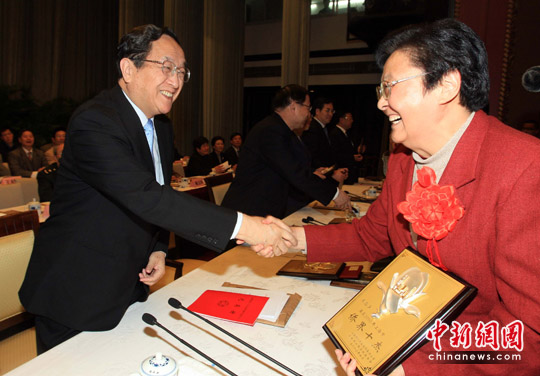 4月7日,上海市第十次归侨、侨眷代表大会举行,中共中央政治局委员、上海市委书记俞正声为上海市侨界“十杰”之一、中科院院士、生物化学与分子生物学家王恩多颁奖。据了解,当今许多海归高级知识分子作为侨界代表,为上海城市发展建言出力,成绩瞩目。中新社发 潘索菲 摄