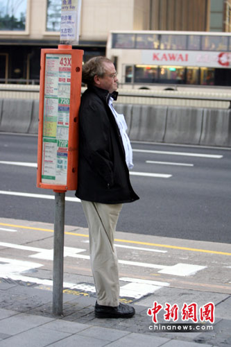 4月7日傍晚,来自东北方向的季候风吹袭香港,一位候车路人借助中环车站站牌躲避寒风。据天文台预报,明天多云有雨的天气里,有几阵狂风雷暴袭击香港,并会带来降温。中新社发 郑祚声 摄