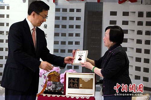 4月8日,近代著名思想家严复先生的孙女、台北振兴医院董事长辜严倬云在台北会见上海市长韩正,致送《严复合集》。中新社发 董会峰 摄