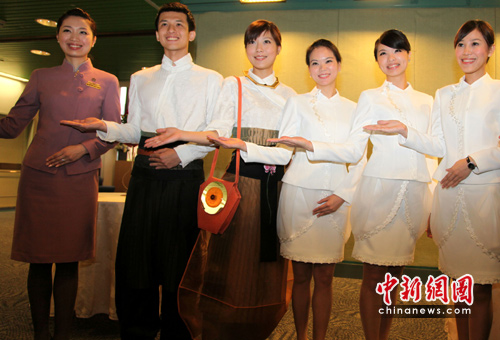4月13日,台北世贸中心举办“2010年上海世博会台湾馆启航记者会”,精挑细选并经由华航进行礼仪培训的台湾馆亲善大使亮相,以微笑作出欢迎参观台湾馆的手势。这些“大使”均具有大学以上学历,从2000名报名者中票选而出。中新社发 董会峰 摄
