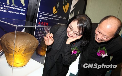 4月13日,台北世贸中心举办“2010年上海世博会台湾馆启航记者会”,由琉璃工房艺术总监杨惠姗特别设计的三款天灯意向艺术作品首度亮相。图为杨惠姗与丈夫张毅在欣赏、介绍雕有水牛群像的文化创意作品“台湾心灯”。中新社发 董会峰 摄
