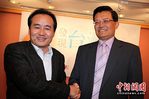 4月14日,大陆主流财经媒体首次正式组团访台,展开以“台湾投资故事”为主轴的深度采访。图为采访团团长、《中国经济周刊》总编辑季晓磊(左),与中华开发工业银行总经理曾垂纪在台北记者会上握手致意。中新社发 董会峰 摄