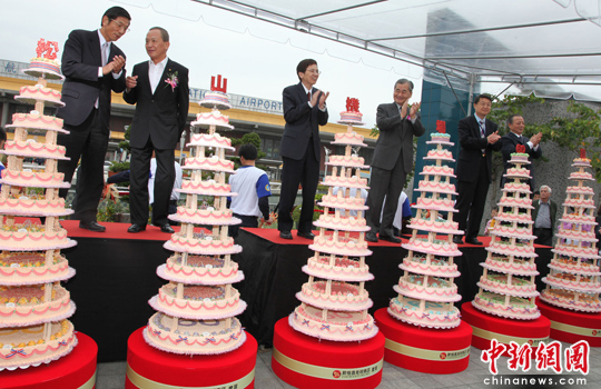 4月16日下午,台北松山机场举行60周年庆,期望两岸早日磋商,促成与上海虹桥机场对飞。图为台湾“交通部长”毛治国(左四)、“民航局长”李龙文(左一)等人,参加6个多层大蛋糕的切庆仪式。据悉,松山机场正在大举整建,准备向商务机场转型。中新社发 董会峰 摄