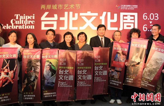 4月16日,台北副市长李永萍(左五)领军著名导演侯孝贤(右三)等一批台湾演艺界资深人士,在上海为“台北文化周”世博启航造势。6月份,堪称台湾最大规模的艺术团体将集结来上海举行数百场演出,包括戏剧大作《超炫白蛇传》以及视觉艺术展、文化论坛等。中新社发 潘索菲 摄