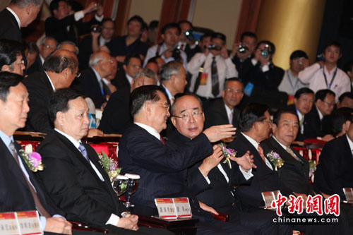 4月20日上午,2010台湾·湖北(武汉)周在台北圆山大饭店开幕。中国国民党荣誉主席连战(前排左三)、吴伯雄(左四),台湾海基会董事长江丙坤、台湾工业总会理事长陈武雄等人出席并致辞,左二为首度访台的中共湖北省委书记罗清泉。中新社发 董会峰 摄
