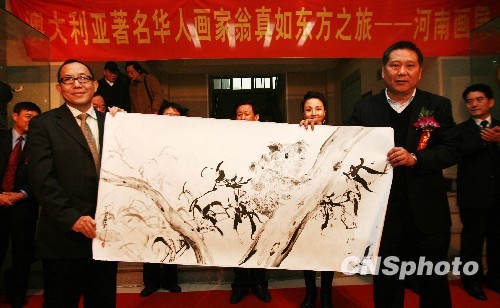 4月20日,澳大利亚著名华人画家翁真如(左)在河南郑州向玉树灾区捐赠自己的心爱画作。翁真如先生祖籍广东梅县,1946年出生于越南,毕业于香港大学建筑专业和香港赵少昂嶺南艺苑,1979年移民澳大利亚,是澳洲太平绅士,画家,教育家。他曾获澳洲艺术界杰出人士奖,美国世界名人协会终身艺术成就金像奖。中新社发 王中举 摄