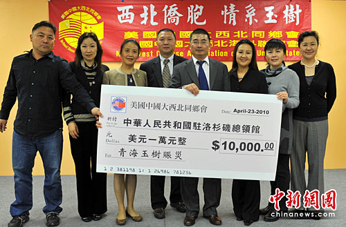 “美国中国大西北同乡会”4月23日向青海玉树地震灾区捐款10000美元,该款项将通过中国驻洛杉矶总领馆转交。大西北同乡会会长贺军平(右四)说,同乡会会员都是来自中国西北五省(区)的侨民,大家收入并不高,惊悉玉树地震后,作为西北老乡,大家感同身受,协会共筹集善款一万美元,“虽然微博,但这是我们的一篇心意”。中新社发 张炜 摄