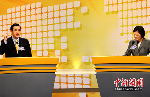 4月25日下午,备受台湾舆论关注的“双英”辩论会在台北登场,马英九(左)坚称两岸商签ECFA必要而且紧迫,双方攻防激烈。图右为民进党主席蔡英文。中新社发 董会峰 摄