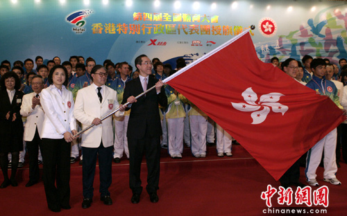 4月26日,第四届全国体育大会香港特别行政区代表团授旗仪式在香港文化中心举行。署理行政长官唐英年以香港特区代表团名誉团长身份主持授旗礼。主礼嘉宾包括民政事务局局长兼代表团团长曾德成、中国香港体育协会暨奥林匹克委员会会长兼代表团副团长和筹备委员会主席霍震霆等。全国体育大会是四年一度的国家级非奥运项目的综合运动会,今届将于五月十六日至二十六日在安徽省合肥市举行。中新社发 张勤 摄