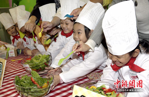 4月28日,为期两个月的“天才小厨神训练计划”在香港荷里活广场开幕。100名小朋友身穿白色整齐的厨服、头戴厨师帽,高兴地在开幕礼上现场制作“缤纷田园沙律”佳肴。中新社发 张勤 摄