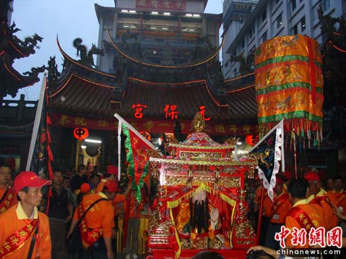 4月28日,农历十五,适逢两岸民众共同信奉的保生大帝1032年圣诞。大陆厦门海沧青礁慈济祖宫保生大帝金身莅临台湾,展开绕境巡逻。图为保生大帝金身在台中市绕境巡游之后,前往台中市最大的保生大帝宫庙台中元保宫驻跸。