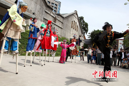 5月1日下午,陕西民间艺术园游会在台北华山创意文化园区登场,华县皮影、华阴老腔、关中木偶、陕北民歌信天游、仿唐面具乐舞等表演刮起一股“西北风”。图为北京奥运表演项目“天地社火”演员踩着高跷,配合武术表演,吸引众多台湾民众驻足观看。中新社发 董会峰 摄