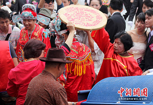 5月2日,在两位喜娘用米筛遮挡下,新娘走下花轿。当天,2010苗栗客家桐花婚礼在台湾苗栗县铜锣乡的桐花公园循古时客家习俗举行。中新社发 罗钦文 摄