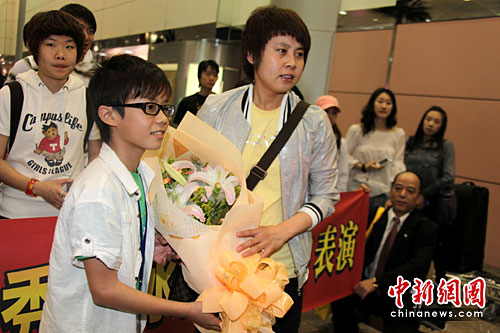 5月3日中午,应中华台北奥委会邀请,大陆优秀滑冰选手访问团一行31人搭乘CA185班机抵台。访问团中群星闪耀,光冬奥会世界冠军就有4名。图为甫在温哥华冬奥会独揽3金的短道速滑名将王濛,接受台湾12岁滑冰好手曹志祎(左)献花。中新社发 董会峰 摄