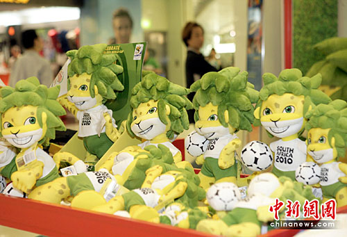 5月10日,2010年南非世界杯吉祥物“扎库米”吉祥物在香港特许商店出售,其活泼可爱的造型吸引目光。中新社发 张勤 摄