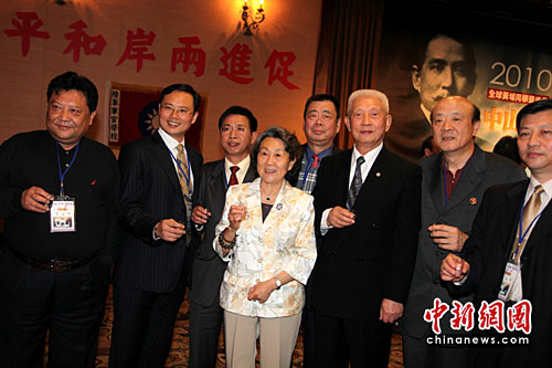 5月11日晚,首次在台北举行的“中山·黄埔·两岸情”论坛闭幕,论坛期望能进一步凝聚共识,团结一心,加速促进两岸关系和平发展。图为惜别酒会上,来自海峡两岸的江苏老乡同举杯、共话别,前中为周恩来总理的侄女、黄埔军校同学会(北京)宣传委员周秉德,右3为台湾退役将领陈廷宠。中新社发 董会峰 摄