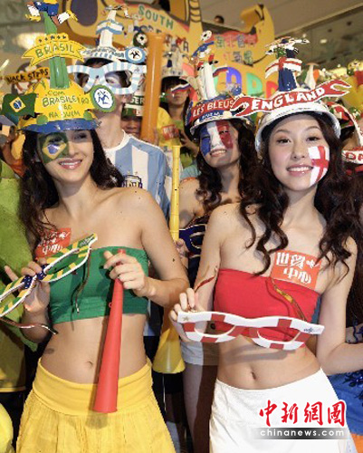 5月13日,为庆祝四年一度世界杯的来临,香港一商家举办《南非世界杯官方打气帽潮艺馆》等活动。图为时尚男女演绎32顶南非世界杯官方指定打气帽现场示范“南非传统打气5式”。中新社发 张勤 摄