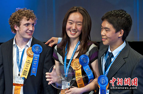 当地时间5月14日,第61届英特尔国际科学与工程大赛在圣荷西州立大学举行隆重颁奖典礼。美国华裔中学生在59个国家的1611名参赛中大放异彩,德州15岁的乔紫薇(中)夺得首次设立的“戈登·E·摩尔”大奖,获75000美元奖学金,俄勒冈州18岁的樊业(右)和他的同校同学凯文·艾利斯(左)获“英特尔基金会青少年科学家奖”,各得50000美元奖学金。图为得奖后三人喜不自禁合影。中新社发 陈钢 摄