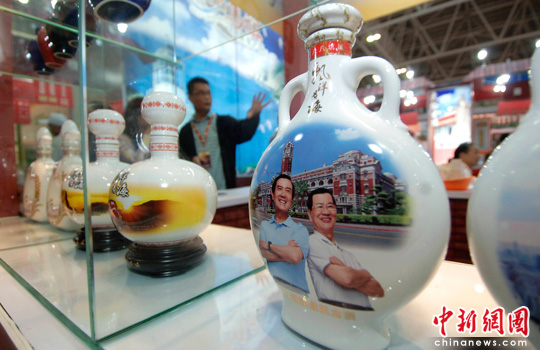 5月18日,贴有马英九、萧万长肖像的台湾白酒亮相第十二届海交会。当日,由国台办、中国贸促会、海关总署、国家质检总局和福建省政府共同主办的第十二届海峡两岸经贸交易会、第七届中国福建商品交易会在新落成的福州海峡国际会展中心开幕,近万名海内外客商赴会。中新社发 王东明 摄