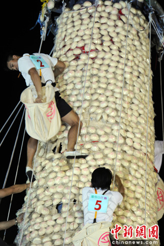 5月22日凌晨,香港长洲特色传统节庆“包山嘉年华2010” “抢包山比赛”,在1500多名观众喝釆加油声中,于长洲北帝庙足球场圆满结束。经过激烈争夺男子组郭嘉明(2号)以939分夺得冠军。中新社发 郑祚声 摄