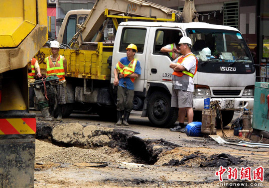 5月23日上午,一批工程人员在香港北角丹拿道地陷现场维修赶工。事发在22日晚上10时多,该路面出现面积约10米乘5米道路塌陷,无人受伤。现场一段道路全线封闭。中新社发 洪少葵 摄