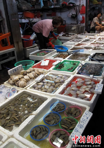 5月23日,在香港北角码头的海鲜市场内,购买贝壳类海鲜的市民明显减少。事因“毒带子”事件扩展至广东及珠海,香港食安中心迄今收到14宗个案、共有28人出现麻痹性中毒,目前仍未查明问题鲜带子产区。当局提醒市民暂时慎吃贝类水产。中新社发 洪少葵 摄