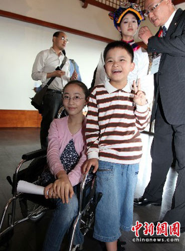 5月24日下午,“四川省感谢台湾社会各界援助‘5.12’地震灾区见面会”在台北举行,在汶川强震中失去一条腿的“芭蕾女孩”李月(左)、勇救同学的小英雄林浩,分别以朗诵诗歌、唱童歌方式,向积极援助四川灾区的台湾同胞表达敬意。中新社发 董会峰 摄
