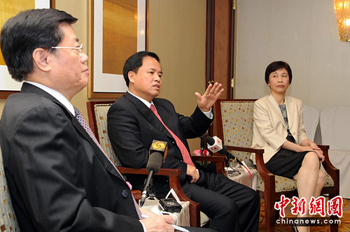 6月3日,厦门市市长刘赐贵(中)在香港会见传媒时表示,厦门也已申报将目前130多平方公里的经济特区范围扩展至厦门全市的1500多平方公里。刘赐贵市长一行是来香港推介第二届世界投资论坛和第14届投洽会,并参访物流、服务、金融等业界。中新社发 郑祚声 摄