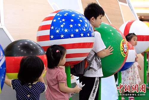 四年一度的世界杯球赛事已拉开战幕多日,香港球迷热情升温不减,到处可见足球赛的宣传元素。图为小足球迷尽显足球兴趣。中新社发 张勤 摄