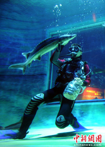 6月17日,香港海洋公园斥资千万港元的新景点“中华鲟馆-长江足迹”落成并向游人开放。作为香港首个以长江为主题、寓教于乐的新景点,通过展板、模型、影片将游人带入中华文化起源的长江,10尾中华鲟及其他珍贵淡水鱼种亦从长江游进展馆容量达42万公升的主鱼池,观众可从各个不同角度就近观察难得一见的“活化石” 中华鲟。中新社发 郑祚声 摄