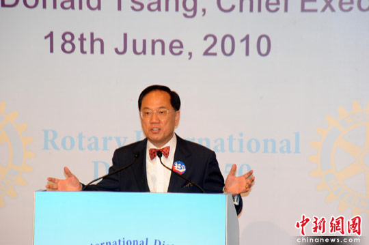 6月18日,香港特区特首曾荫权应邀出席慈善组织国际扶轮3450区(中国香港、澳门及蒙古国)联席午餐会,并在演说时表示:会把握分分秒秒争取各界支持“政改”方案。中新社发 郑祚声 摄