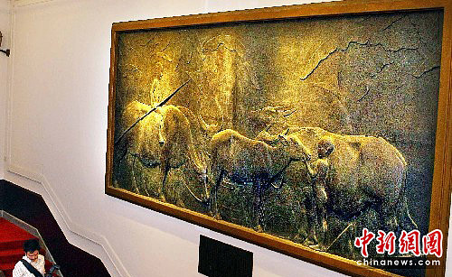 6月22日,台湾中华邮政公司在台北举行“台湾雕塑邮票:水牛群像”发行典礼。这次发行的台湾雕塑邮票为小型张1张。据悉,《水牛群像》浮雕是台湾艺术家黄土水(1895---1930)生前的最后一件作品,原作镶嵌在中山堂光复厅墙壁之上。图为《水牛群像》浮雕原作。中新社发 宋吉河 摄