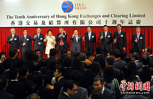 6月22日,香港交易及结算所有限公司(港交所)成立十周年举行庆祝酒会。图为特区行政长官曾荫权、港交所主席夏佳理及集团行政总裁李小加等在酒会上举杯庆祝。中新社发 邓庆乐 摄