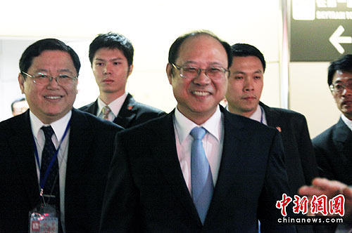 6月23日下午,海峡两岸关系协会常务副会长郑立中乘坐华航航班自北京抵达台湾桃园机场。郑立中等此次台湾行,将为两会领导人第5次会谈的有关安排,与海基会副董事长兼秘书长高孔廉等进行预备性磋商,包括商定两会第五次会谈时间、地点及主要安排,并为签署《海峡两岸经济合作框架协议》和《海峡两岸知识产权保护合作协议》作准备。图为郑立中(前右一)在海基会副秘书长高文诚(左)陪同下步出桃园机场。中新社发 黄少华 摄
