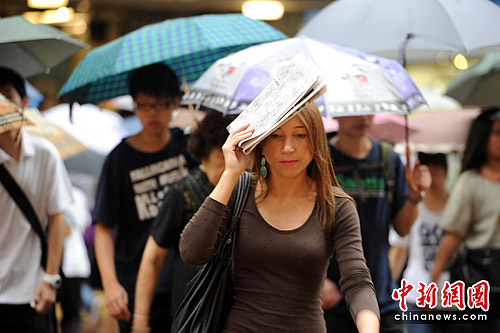 6月24日,香港晴雨交加,令从湾仔地铁站步出的行人防不胜防。当天,港岛的雨势较大,曾录得超过60亳米雨量。天文台预报,骤雨及几阵狂风雷暴将袭击香港。中新社发 郑祚声 摄
