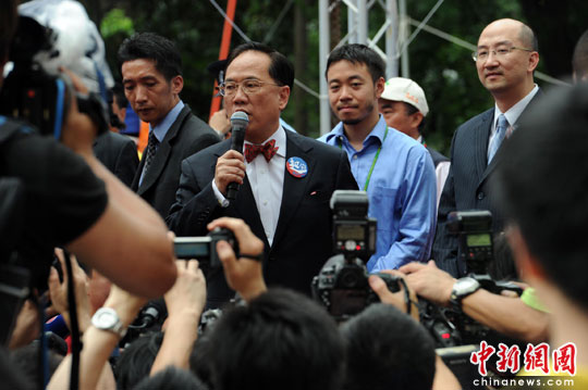 6日25日中午,香港特首曾荫权来到香港立法会外看望支持政制改革的民众。当日,立法会继续审议2012年立法会产生办法决议案。中新社发 郑祚声 摄