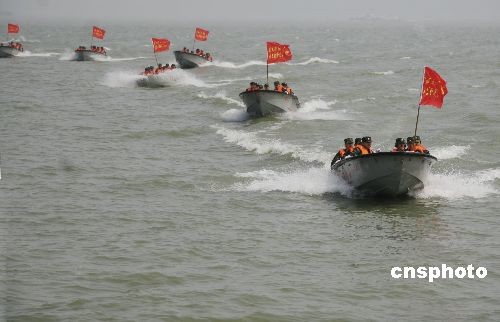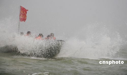 2009年6月13日,安徽巢湖预备役团水上抢险救灾分队130余人携12艘冲锋舟在巢湖水面上摆兵布阵,进行水上“S” 形穿越、水上越障、抗洪抢险救灾、解救被困群众、打捞救护、水上编队等科目的实战演练,以应对大汛期间各类水上搜救。 中新社发 李远波 摄