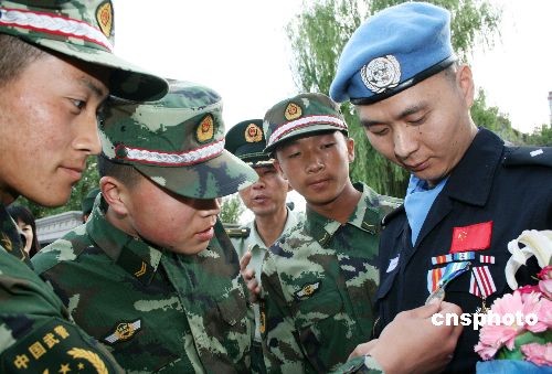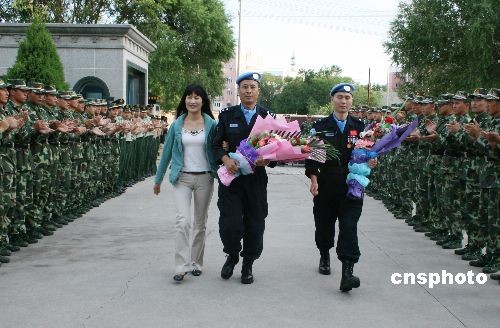 6月17日,出色完成海地维和使命的中国第七支赴海地维和警察防暴队成员、新疆博尔塔拉蒙古自治州公安某部警官杨良、崔继伟和李强载誉归来,受到了社会各界的热烈欢迎。该防暴队由新疆公安边防总队独立组建,于2008年8月代表中国政府、中国警察远征海地,圆满完成为期10个月的联合国海地任务区维和任务。中新社发 杜伟 摄