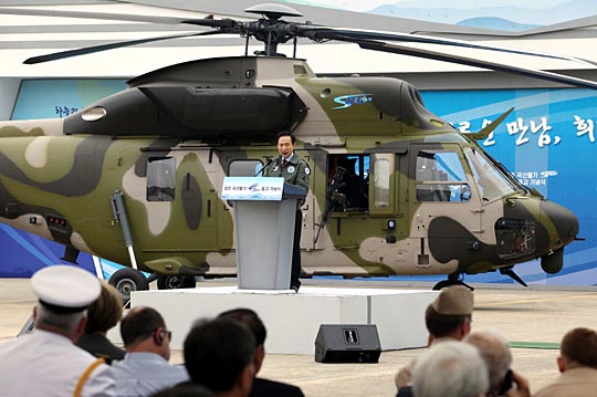 7月31日,韩国总统李明博出席在韩国南部城市泗川举行的新型直升机“Surion”揭幕仪式。该型直升机为军事运输直升机,将替换老化的美军直升机。该机飞行时速为260公里/小时,载有两名枪手。