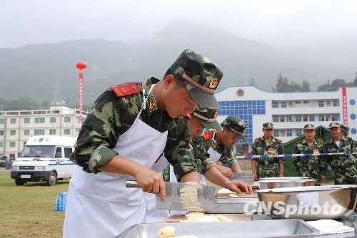 8月4日,武警福建总队举办后勤专业技能比武竞赛活动,检验官兵的实战水平。来自所属部队的13支代表队,参加了炊事专业、财务专业、军械专业、战伤救护、帐篷搭设、汽车驾驶技能等9个科目的比赛。图为参赛选手正在进行炊事专业的刀工比赛。中新社发 曾朝群 摄